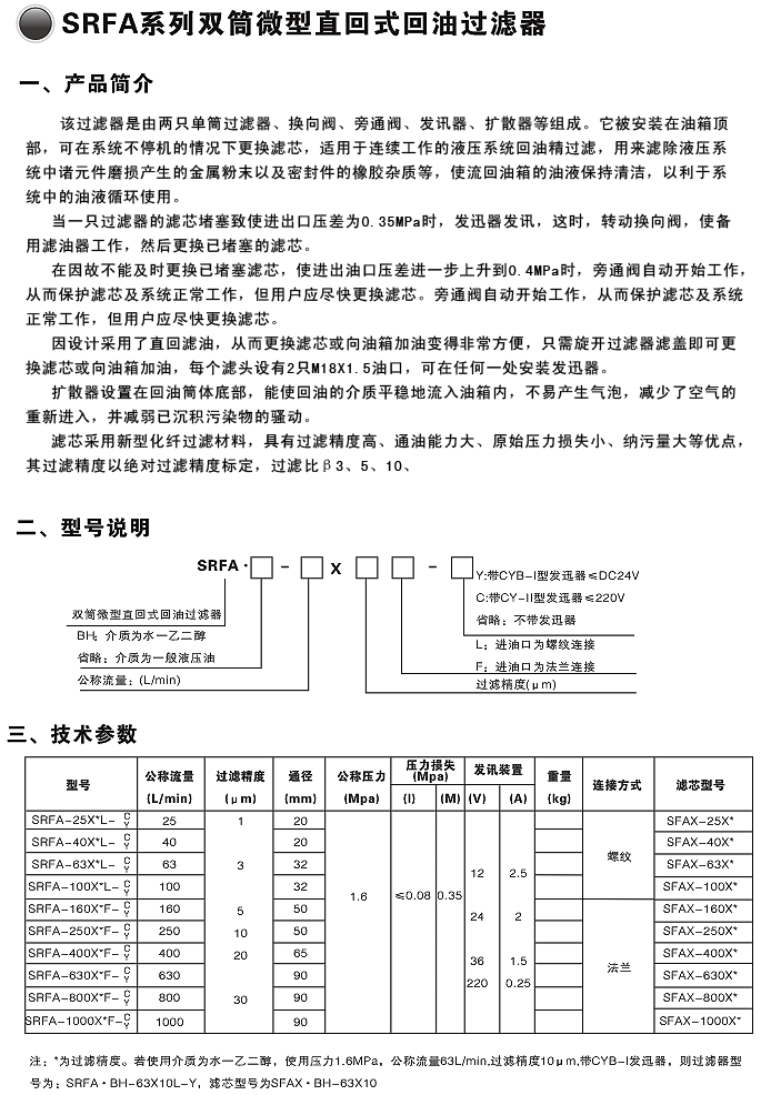 SRFA系列雙筒微型直回式回油過(guò)濾器